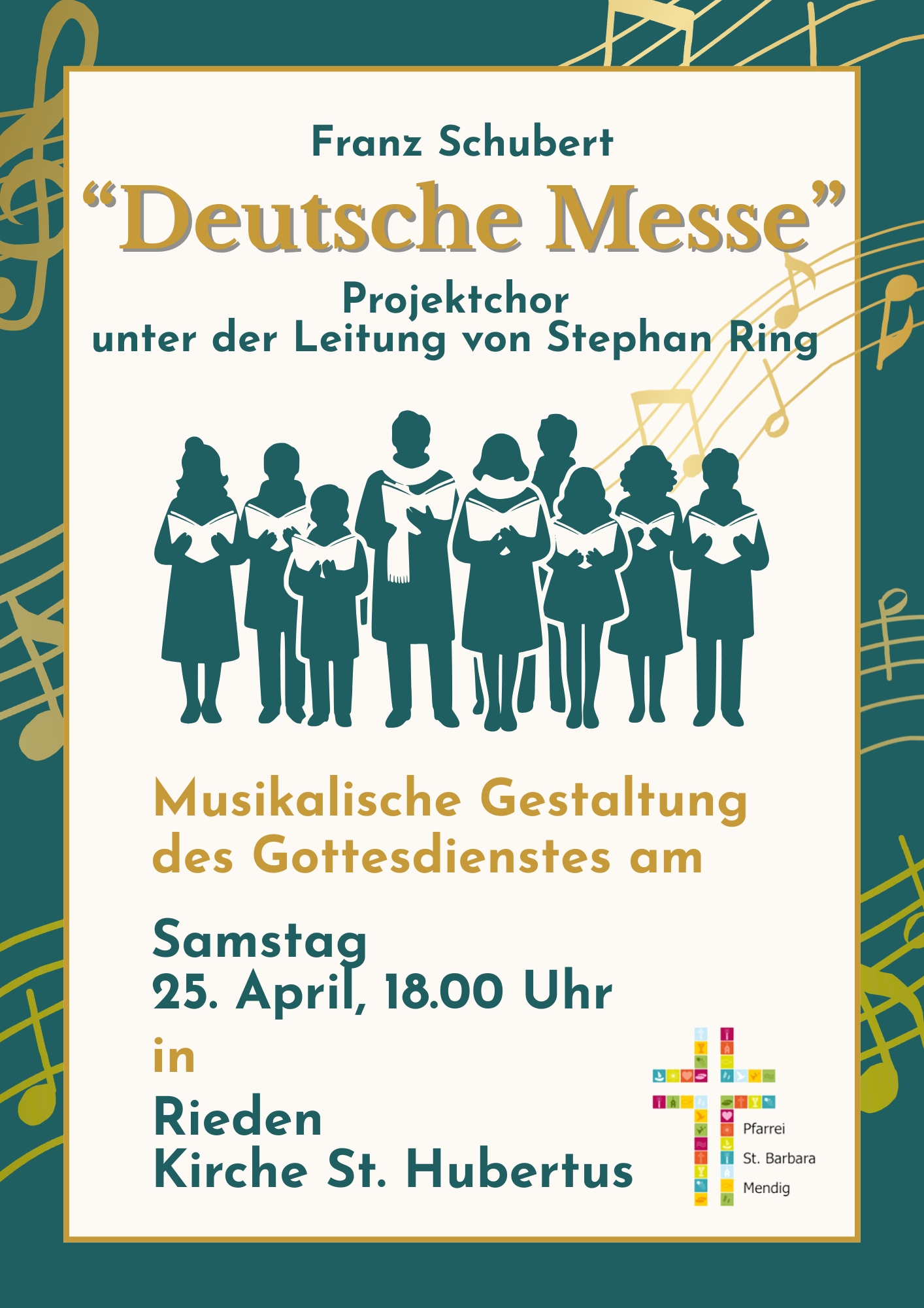 Am Samstag, den 25. April 2026, um 18.00 Uhr wird der Gottesdienst in der Kirche St. Hubertus Rieden musikalisch von einem Projektchor unter der Leitung von Stephan Ring gestaltet.