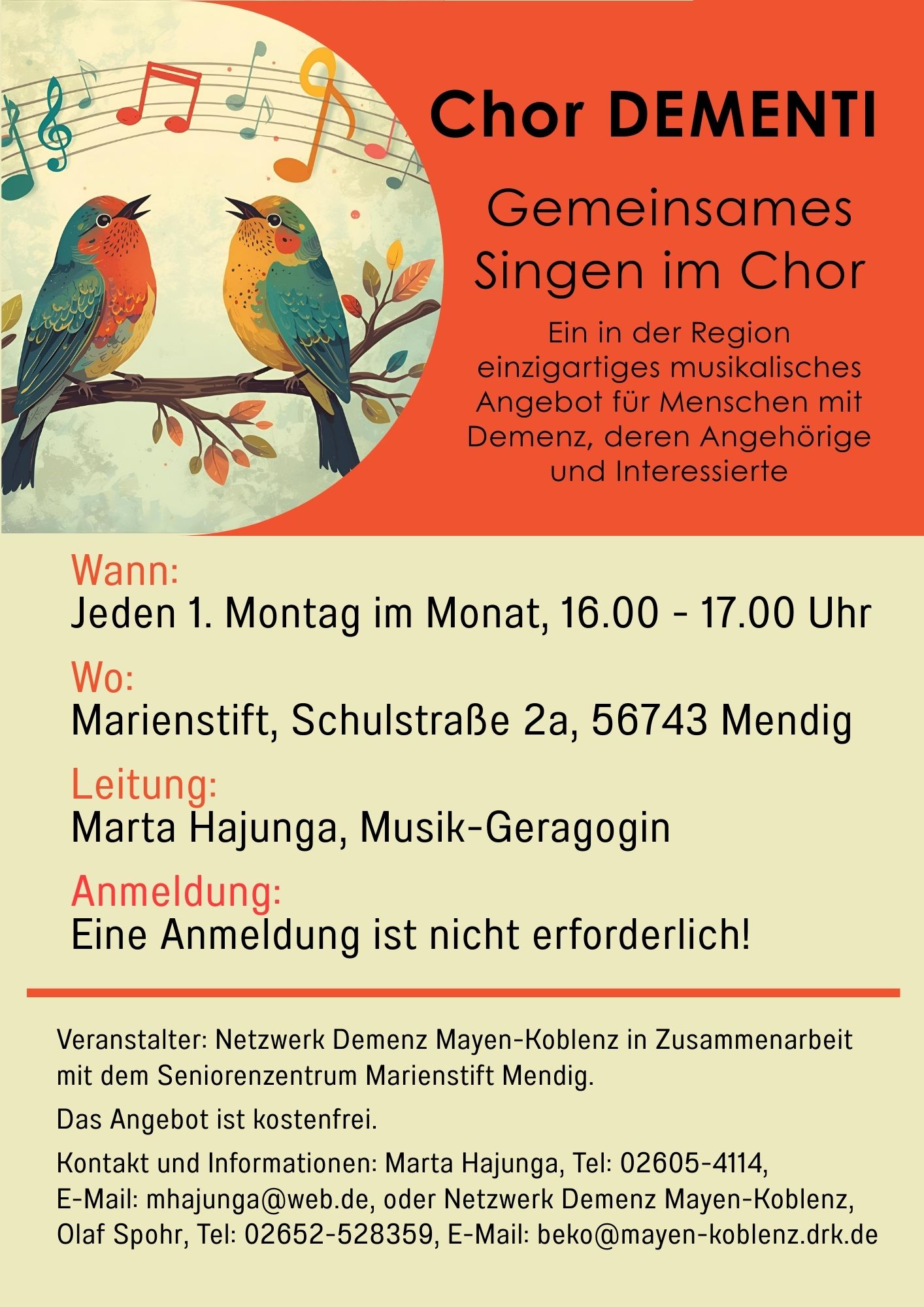 In Mendig gibt es ein in der Region einzigartiges Chorprojekt in Trägerschaft des Netzwerks Demenz Mayen-Koblenz, in dem auch viele kirchliche Organisationen vertreten sind.